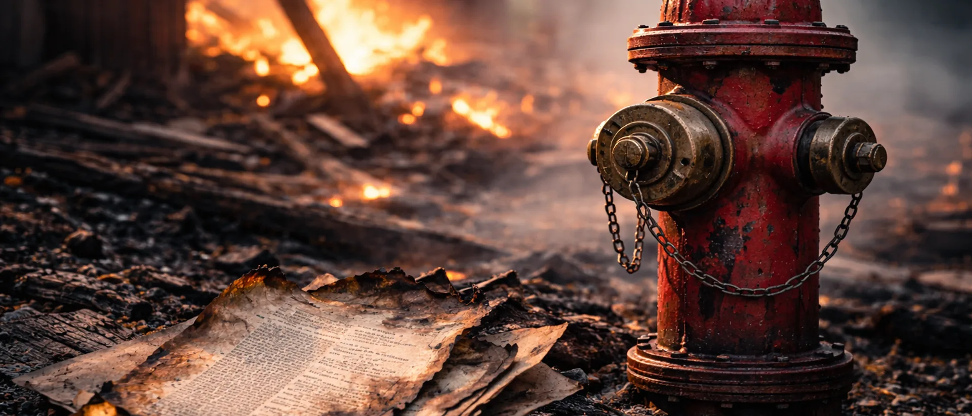The fire hydrant stands as a monument to both human ingenuity and the fragility of knowledge. Sometimes the things that save us from destruction can't save themselves.