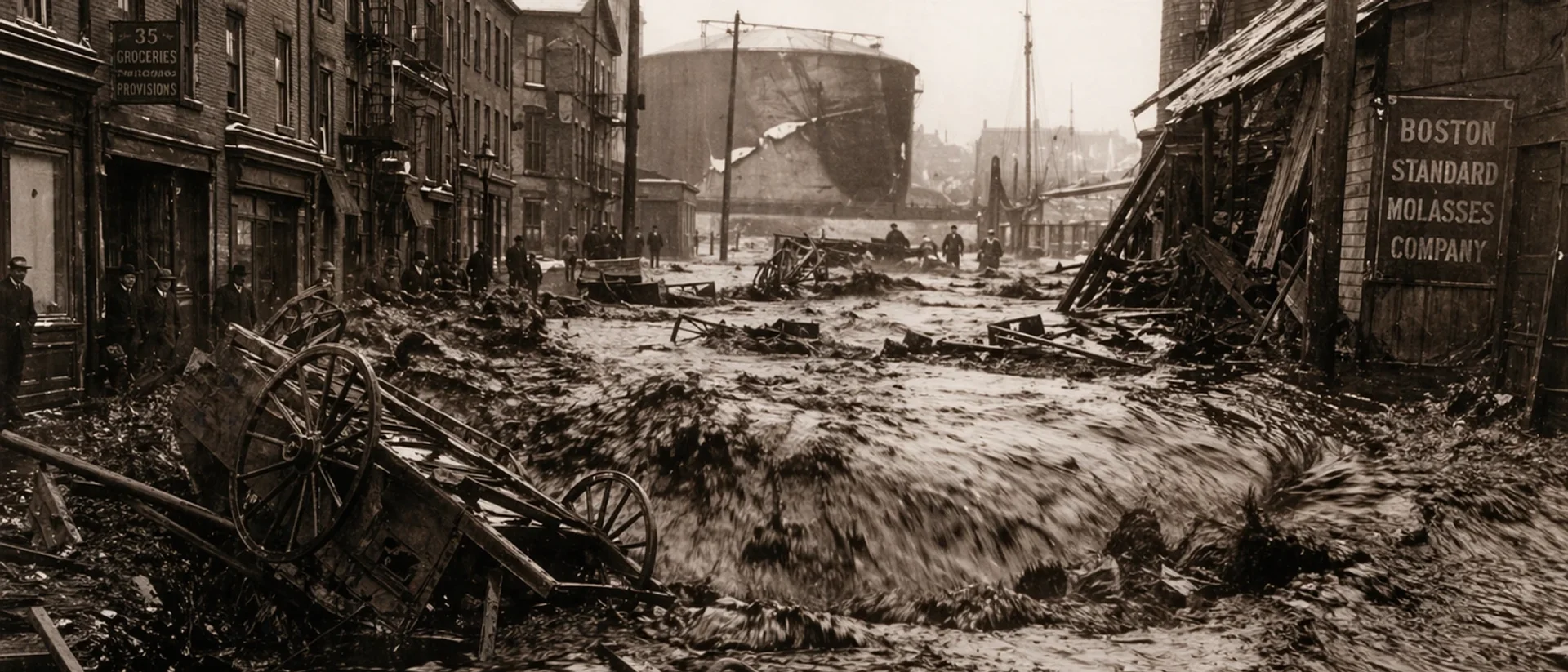 On January 15, 1919, a 50-foot steel tank in Boston's North End burst and released 2.3 million gallons of hot molasses. The sticky wave rushed down Commercial Street at roughly 35 mph, reached 15 feet high in places, and claimed 21 lives. Locals swore the streets smelled sweet for decades.