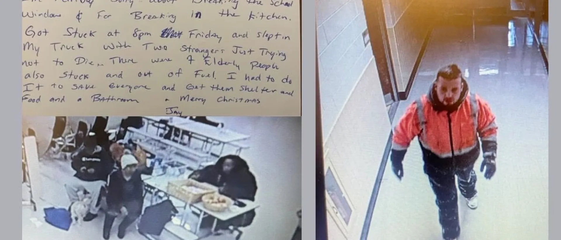 During the 2022 Buffalo blizzard, Jay Withey knocked on 10 doors begging for shelter. All 10 said no. He smashed a window at Pine Hill School and guided 24 stranded strangers inside. He found cereal in the cafeteria and gym mats for beds. Before leaving, he left a note: "I'm terribly sorry about the window. I had to save everyone. Merry Christmas, Jay." Police put out a call to find him. Not to arrest him. To thank him.