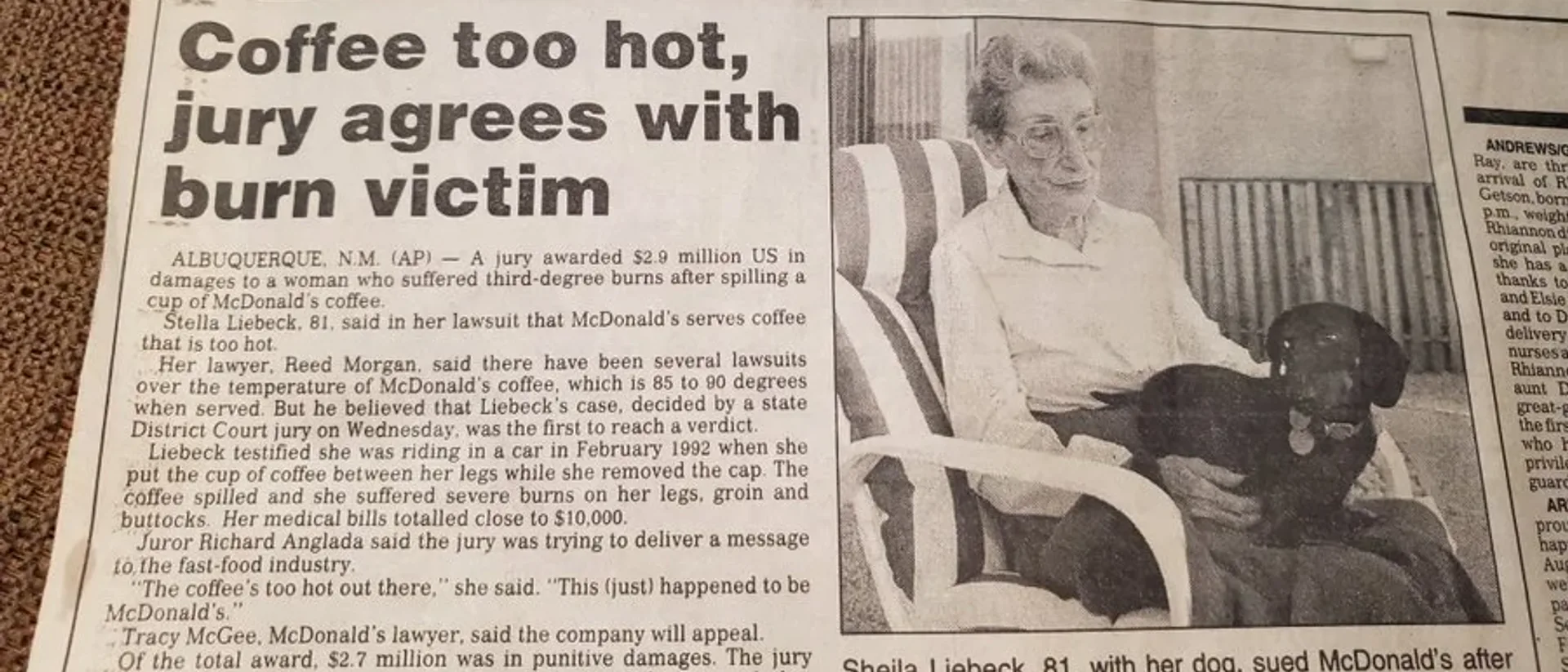 On February 27, 1992, 79-year-old Stella Liebeck was in the passenger seat of her grandson's parked car. She placed the cup between her knees to add cream and sugar. The lid came off. The coffee soaked into her sweatpants.