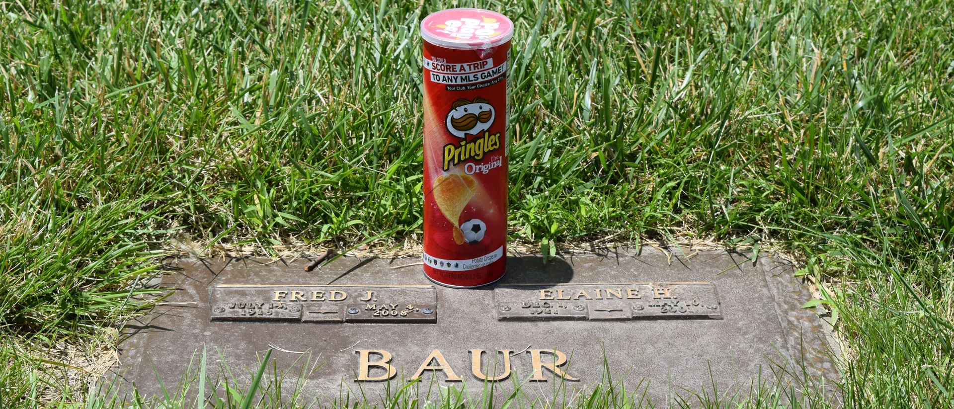 After Baur's cremation, his children stopped at a Walgreens to buy a can of Pringles. They debated which flavor to choose—ultimately selecting original flavor—and then divided their father's ashes. Some went into a traditional urn for burial at Arlington Memorial Gardens in Cincinnati, Ohio. The rest were placed inside the Pringles can, which was buried alongside the urn.