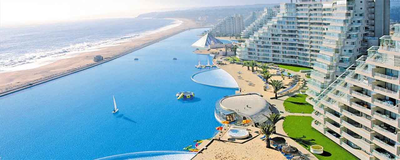 The world’s largest swimming pool can be found at the San Alfonso del Mar resort in Chile. The pool is 1,013 m (3,324 ft) long, has a maximum depth of 35 m, and even has sailing boats.