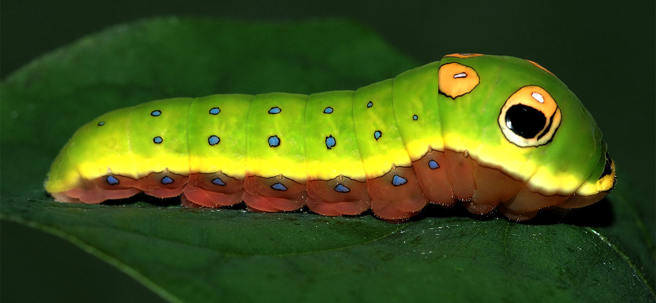 The eyespots aren't actually eyes at all—they're a brilliant defense mechanism. These fake eyes make the tiny caterpillar look like a small snake or tree frog, scaring off birds and other predators that would otherwise see it as an easy snack.